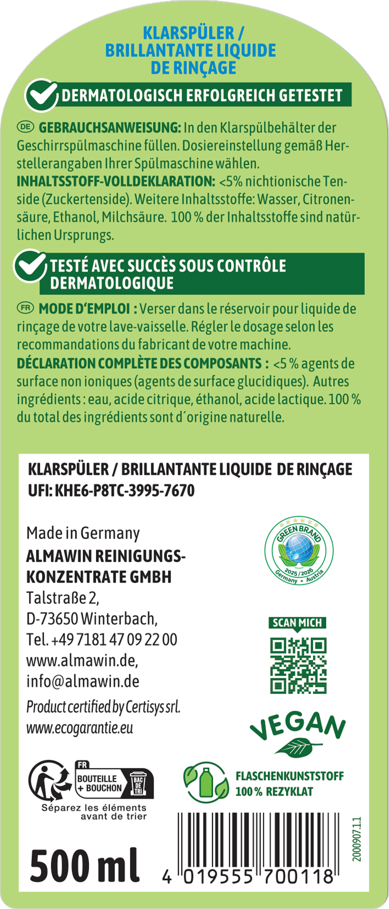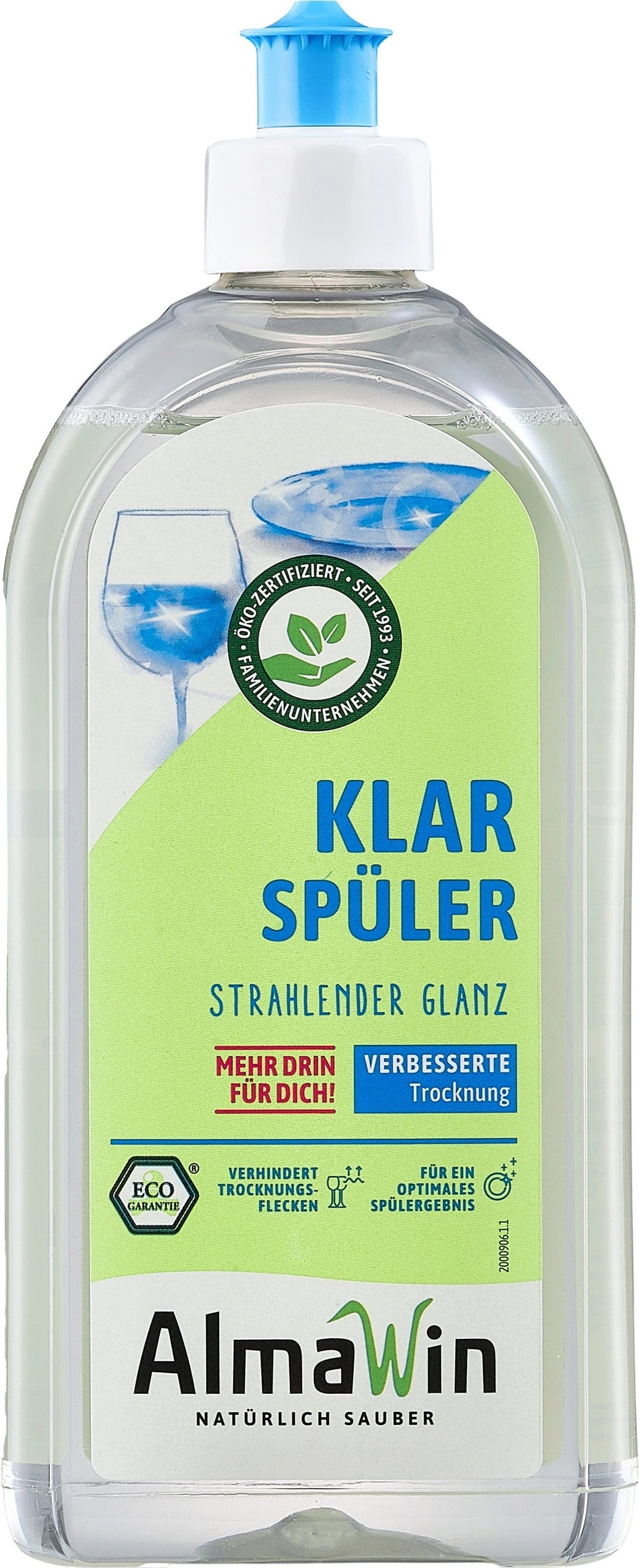 Durch die Kombination von Milch-, Zitronensäure und pflanzlichem Alkohol sorgt der Klarspüler von AlmaWin für glänzendes Geschirr und kann für alle Haushaltsspülmaschinen eingesetzt werden.