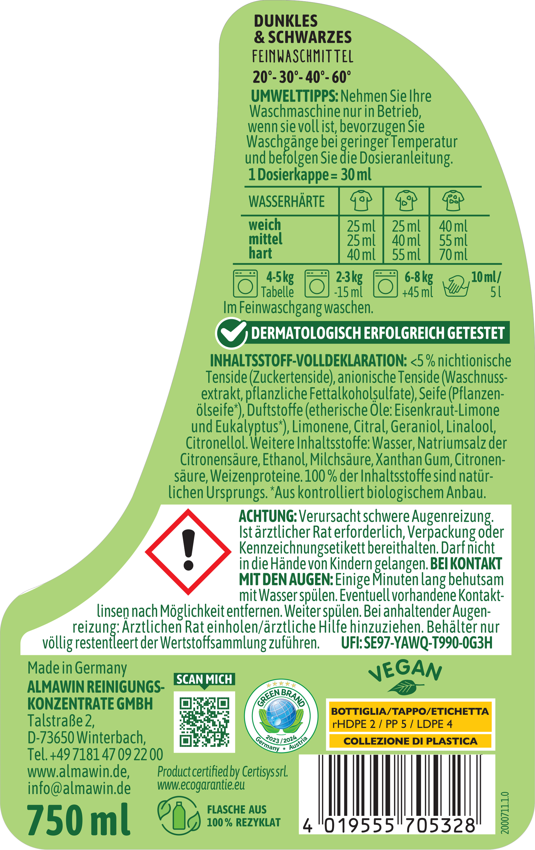 Das AlmaWin Waschmittel für Dunkles und Schwarzes ist ein Öko-Konzentrat, welches besonders hautverträglich und biologisch sehr gut abbaubar ist. Es ist für alle dunklen und schwarzen Textilien aus Natur-, Misch- und Synthetikfasern und sowohl für Hand- als auch Maschinenwäsche geeignet.
