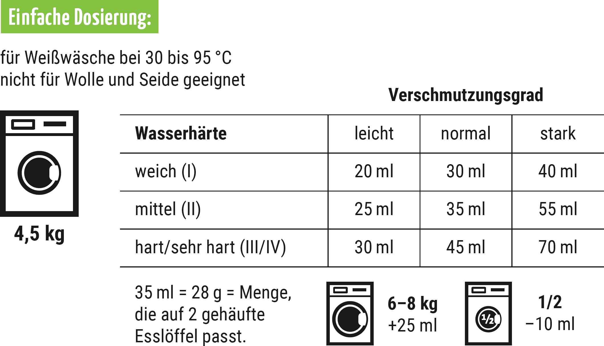 Bei größeren Waschladungen (6 - 8 kg) verwende 25 ml mehr als die Normal-Dosierung.