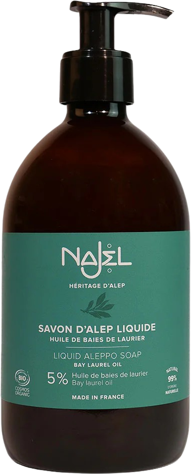 Entdecke die echte Aleppo-Seife in flüssiger Form, die auch für trockene, sensible und irritierte Haut geeignet ist. Sie ist ein authentisches Produkt, das in der ganzen Welt berühmt ist. Najel stellt sie ausschließlich mit Bio-Olivenöl und Bio-Lorbeerbeerenöl her, um ein Naturprodukt von herausragender Qualität liefern zu können. Entdecke mit dieser Aleppo-Seife das ganze handwerkliche Know-How der syrischen Seifensiedermeister!