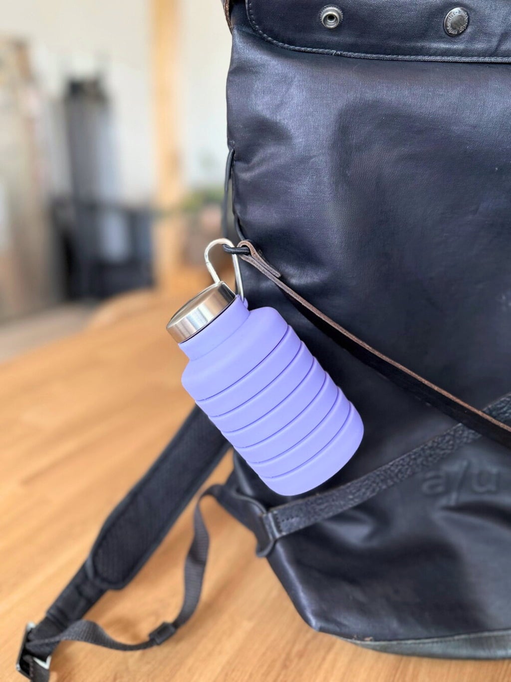Diese faltbare Trinkflasche aus Silikon ist der perfekte Begleiter für unterwegs, egal ob auf Reisen oder beim Sport. Sie lässt sich super praktisch und kompakt auf circa ein Drittel ihres Volumens reduzieren und besitzt auch einen Karabiner, mit dem du sie ganz einfach am Rucksack befestigen kannst. Die Flasche ist auslaufsicher, auch bei kohlensäurehaltigen Getränken und sie ist für die Spülmaschine geeignet. Die perfekte Lösung für alle, die gerne unterwegs sind und auf Nachhaltigkeit setzen.